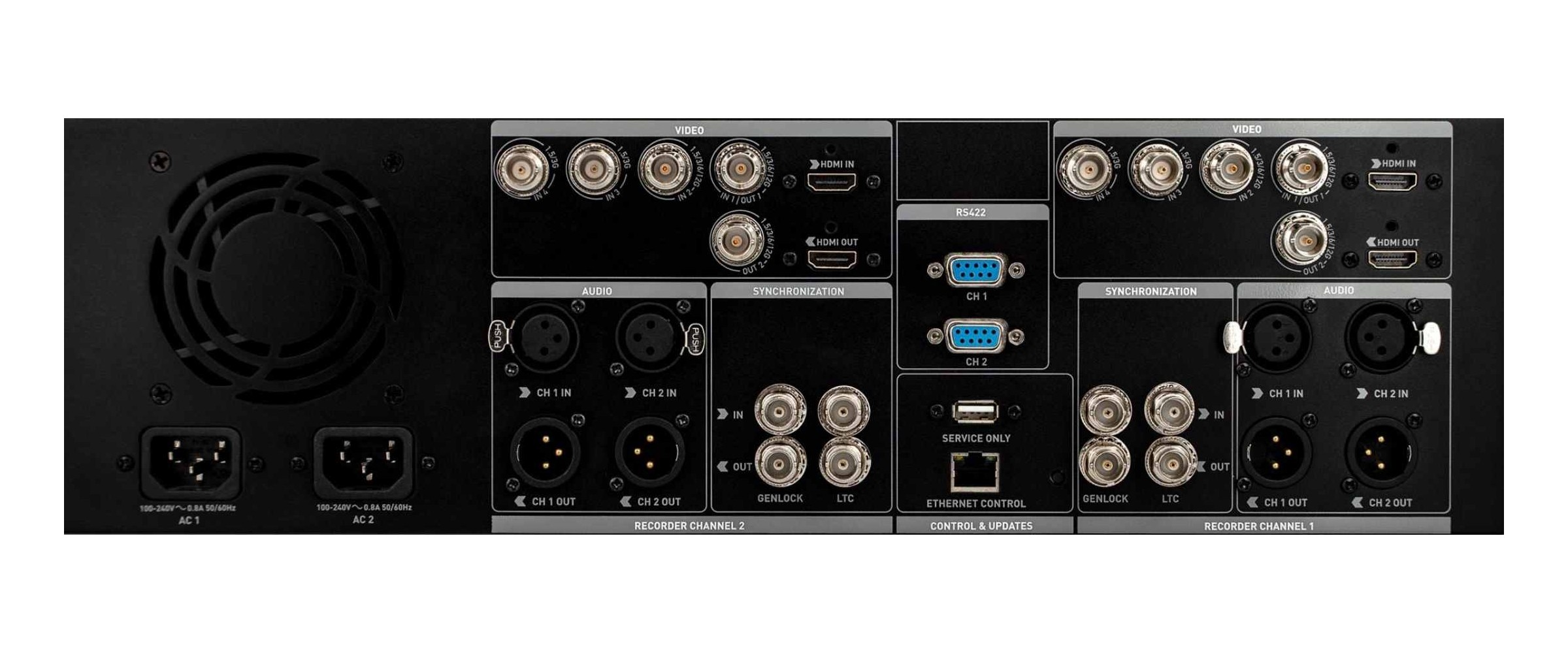 A Shogun Studio 2 lényegében két darab recorder-monitor egybeépítve egy rack-es formátumba. Mindkét egység rendelkezik 2×3G, 2×12G-SDI és 1×HDMI 2.0 bemenettel, valamint 1×12G-SDI és 1×HDMI 2.0 kimenettel, 2×XLR be- és kimenetekkel, amelyek 48V-os fantomtápot is biztosítanak, továbbá mindegyik rekorder saját 3.5mm fejhallgató kimenetet biztosít a hangfelvétel lehallgatásához.