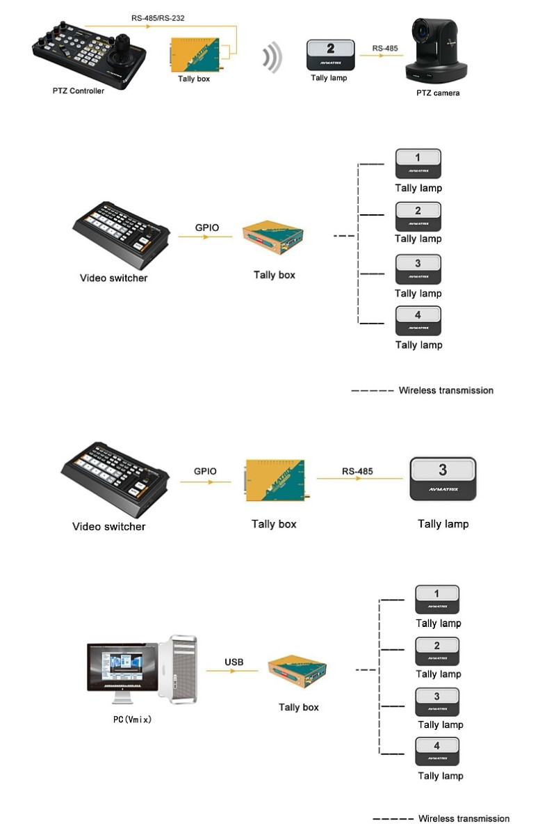 Vmix, video switchers with GPIO-tally interface such as AVMatrix, Roland, Sony, NewTek, Panasonic, DataVideo or tally converter box with GPIO such as BMD's GPI and tally interface |
