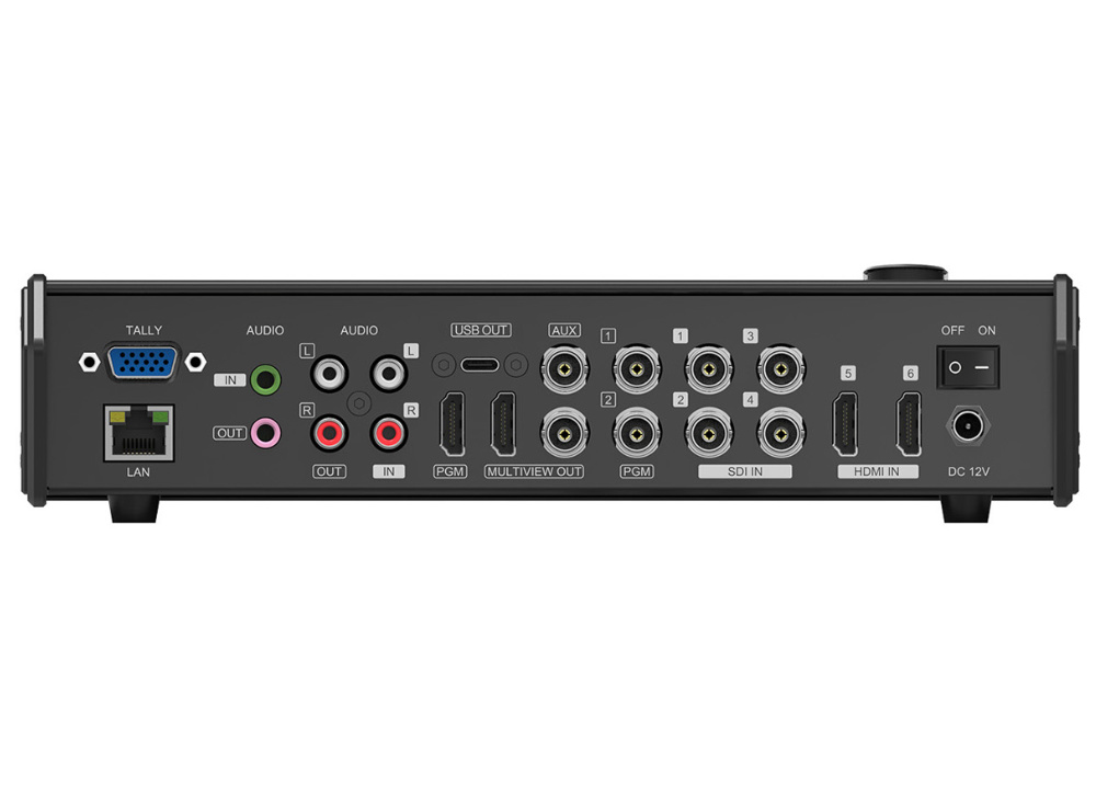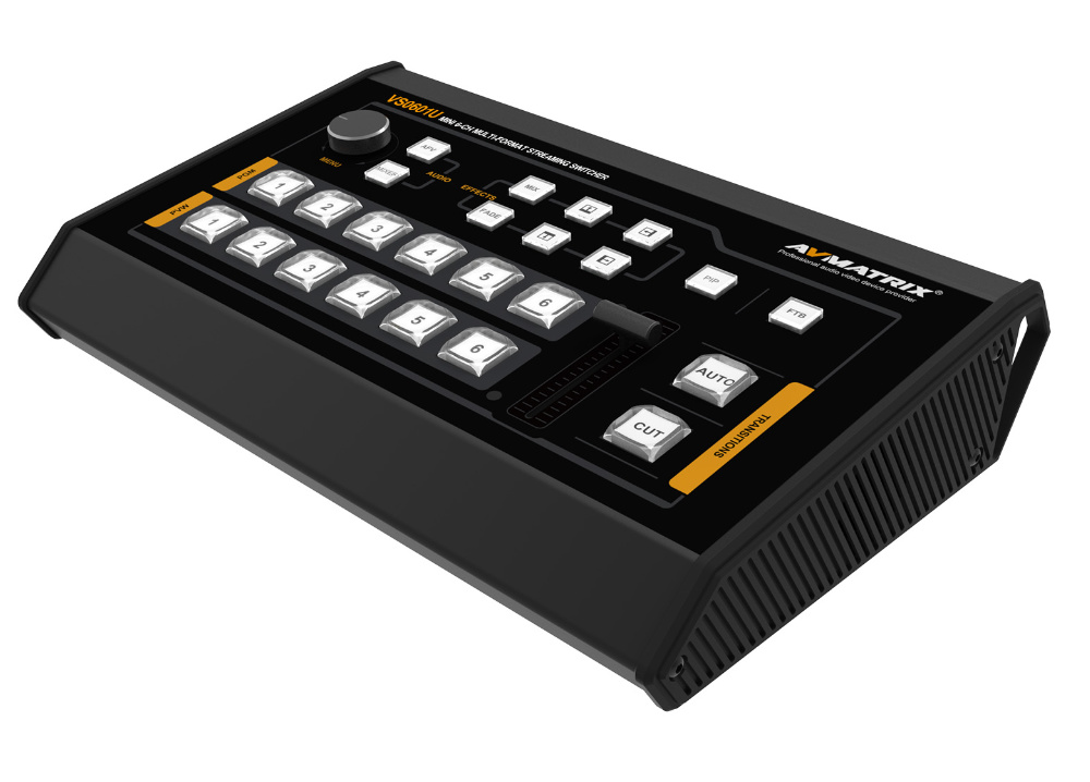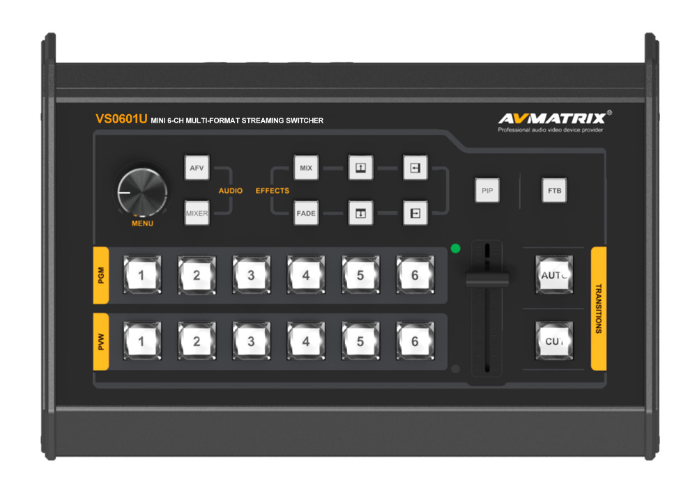 Az AVMatrix VS-0601U egy sokoldalú, költséghatékony megoldás élő adásokhoz, 4 SDI (SD/HD) és 2 HDMI (SD/HD) videó/audió jel keverésére. A mixer az SDI és HDMI jelbe ágyazott hangot kezeli, ezen felül egy sztereó jack és két RCA csatlakozó szolgál bemenetként.
