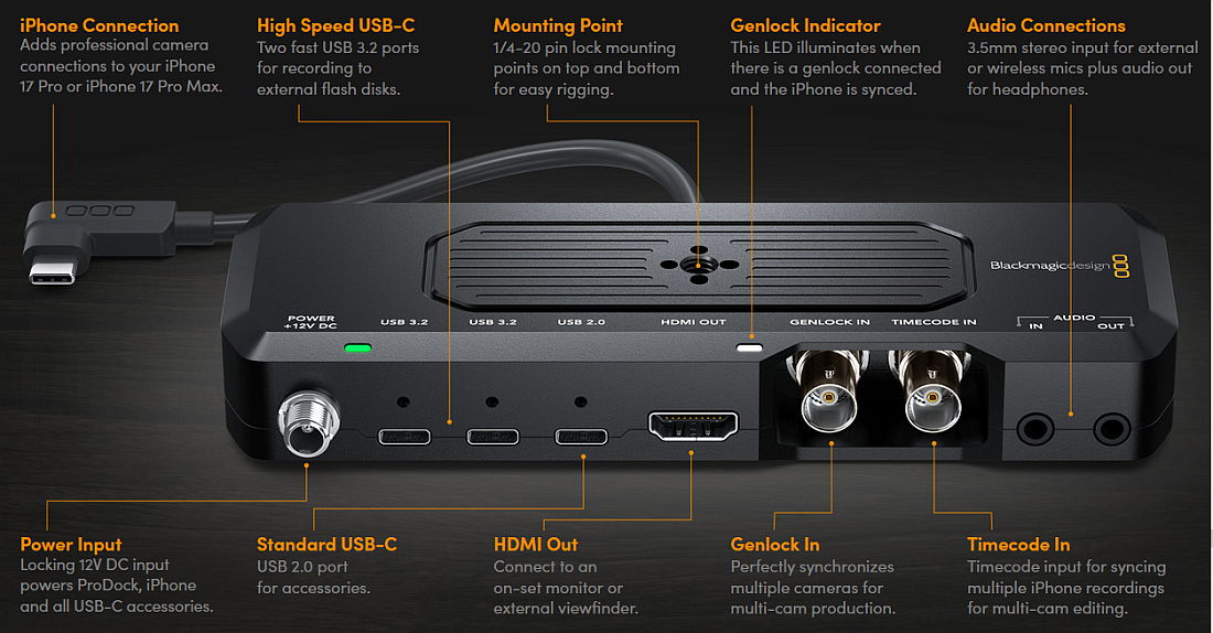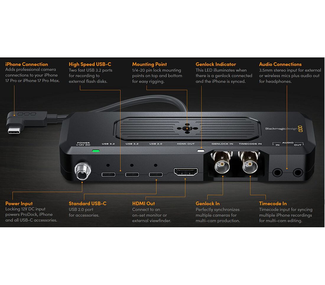 A Blackmagic Camera ProDock lehetővé teszi az iPhone számára professzionális produkciókba való integrálását. Az iPhone-t a ProDock-hoz kötve egy USB-C kábellel az iPhone-ról elérhetővé válnak a ProDock interfészei, melyeket különböző kiegészítők, hangrögzítő eszközök, külső tárolóeszközök és vezérlők csatlakoztatásához alakítottak ki. A ProDock rendelkezik Genlock és Timecode csatlakozásokkal a felvételek szinkronizálásához, 3x USB-C porttal kameravezérlőkhöz vagy merevlemezekhez felvételek tárolásához, 1x HDMI kimenettel a felvételek monitorozásához, és 2x 3,5mm audio csatlakozással mikrofonhoz és fejhallgatóhoz.