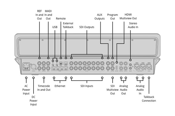 1 x multi view via SDI and HDMI configurable to 16, 13, 10, 7 or 4 up views. Includes monitoring of Program, Preview, Inputs, Media Players, DSKs, SuperSource, Clean Feed with optional labels and audio meters. |
