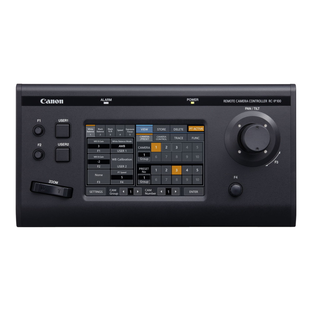 IP hálózaton keresztül 99 kamerára a Canon XC IP protokollal (nem standard LAN), és egy soros RJ45 portról CR-N500 és CR-N300 kamerákra (RS-422 soros protokol támogatással) - 7"-os LCD érintőképernyő: konfigurálás, kamerák közötti váltás és a kamerabeállítások kezelése
