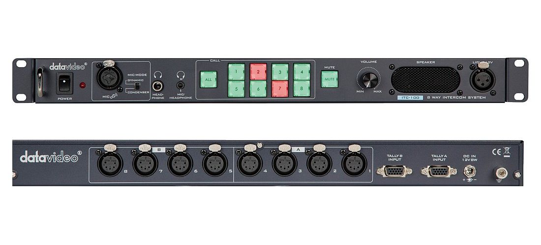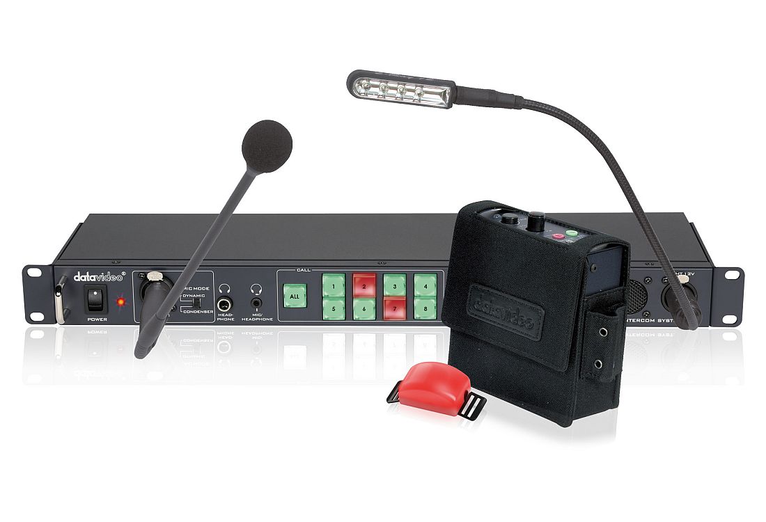 The Datavideo ITC-100 Intercom System provides 8-Way talkback and tally indicators. The director can select to talk to an individual channel or to all channels simultaneously.