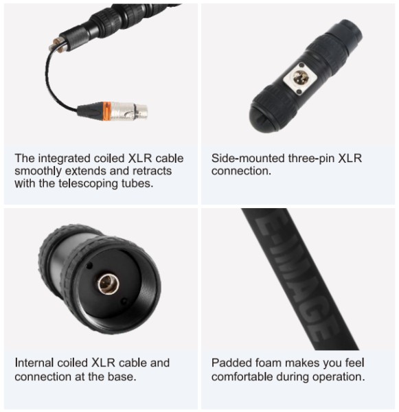 A teleszkópos mikrofontartó rúd max. 5m-es hosszban, 5 szekcióban nyitható, anyaga karbonszál, súlya 1,4kg. A rúdba épített XLR spirálkábel kényelmes és elegáns használatot biztosít, a spirálkábel folyamatosan nyúlik / visszahúzódik a teleszkópos rudak széthúzásával / összetolásával. A spirálkábel egyik vége a mikrofonrúd markolatába épített 3-tűs XLR csatlakozóban, másik vége pedig XLR lengőcsatlakozóban végződik.