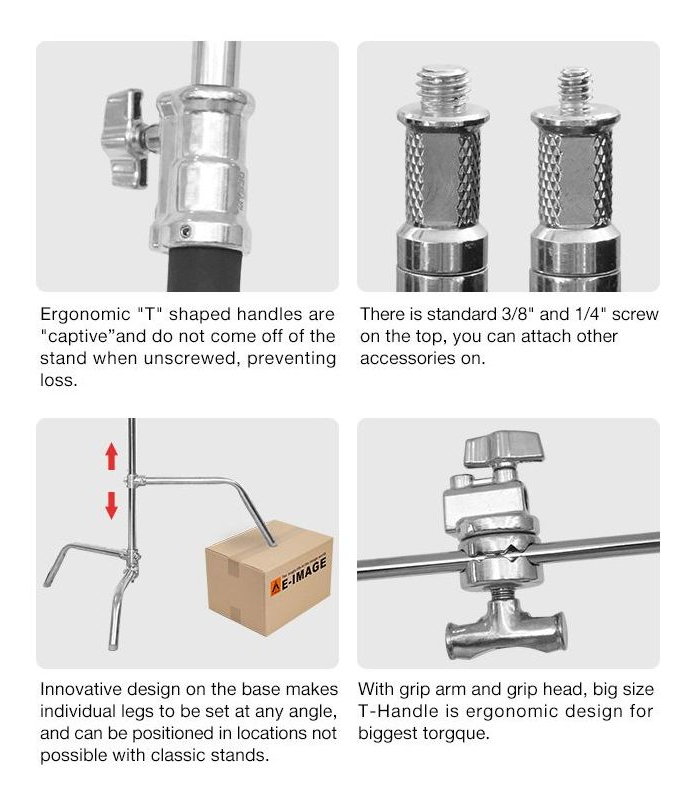 Az LCS-04 C-Stand kit-et elsősorban filmes alkalmazásra tervezték, az E-Image LCS C-stand sorozatának legmagasabbra nyitható tagja. Terhelhetősége a maximális magasságon (amely a keresztrúddal megközelítheti a 4 métert), 20 kg. A konkurens termékek legtöbbjénél nagyobb, 100cm-t meghaladó lábátmérője biztos alapot nyújt a lámpák, kiegészítők 3m feletti használatához is. Az LCS04 rozsdamentes acélból készül, kihúzható középoszlopból, 2 db gobó fejből és keresztrúdból áll. Az LCS04-et a sorozat többi tagjától a tartozék puha fogantyú és az egyedileg állítható magasságú egyik láb (lépcsőjáró kialakítás) különbözteti meg. A gyorszáras mechanizmusának köszönhetően a lábakat könnyen rögzíthetjük egymáshoz képest bármely szögben vagy a lábak egymás mellé csukhatóak megkönnyítve ezzel a tárolást és a szállítást.
