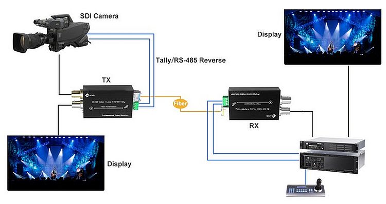 - HD/3G-SDI videójel (beágyazott audio), Tally és Reverse RS-485 átvitel