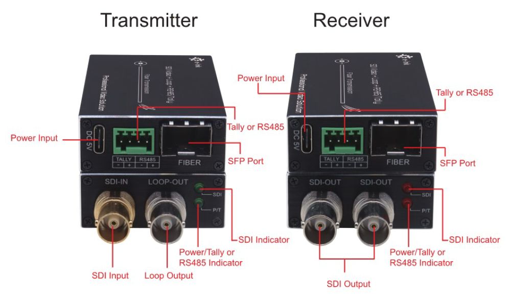 - Receiver/vevő: kettős 3G-SDI kimenet, Tally és (Reverse) 485 bemenet