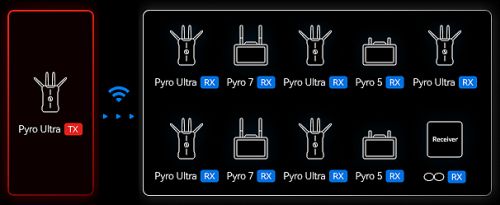 A Broadcast módot aktválva a Pyro Ultra egy jeladójához korlátlan számú jelvevő csatlakoztatható.