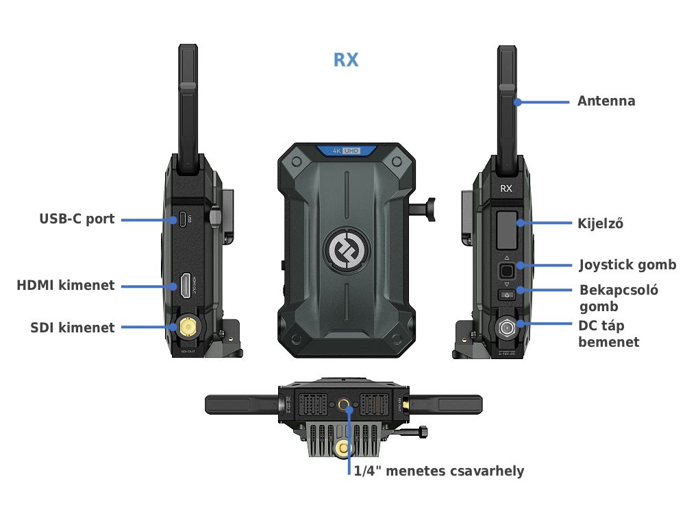 Az RX a videó kimeneti felbontását automatikusan a csatlakoztatott eszközhöz igazítja, vagyis függetlenül attól, hogy a jelátvitel 4K60-nal történik, az RX 1080p felbontást ad le.