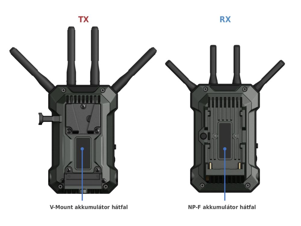 Az 1TX/1RX és 1TX/2RX szettek tartalmaznak egy D-Tap – locking DC tápkábelt is, amely lehetővé teszi az eszközök külső akkumulátorról történő tápellátását.