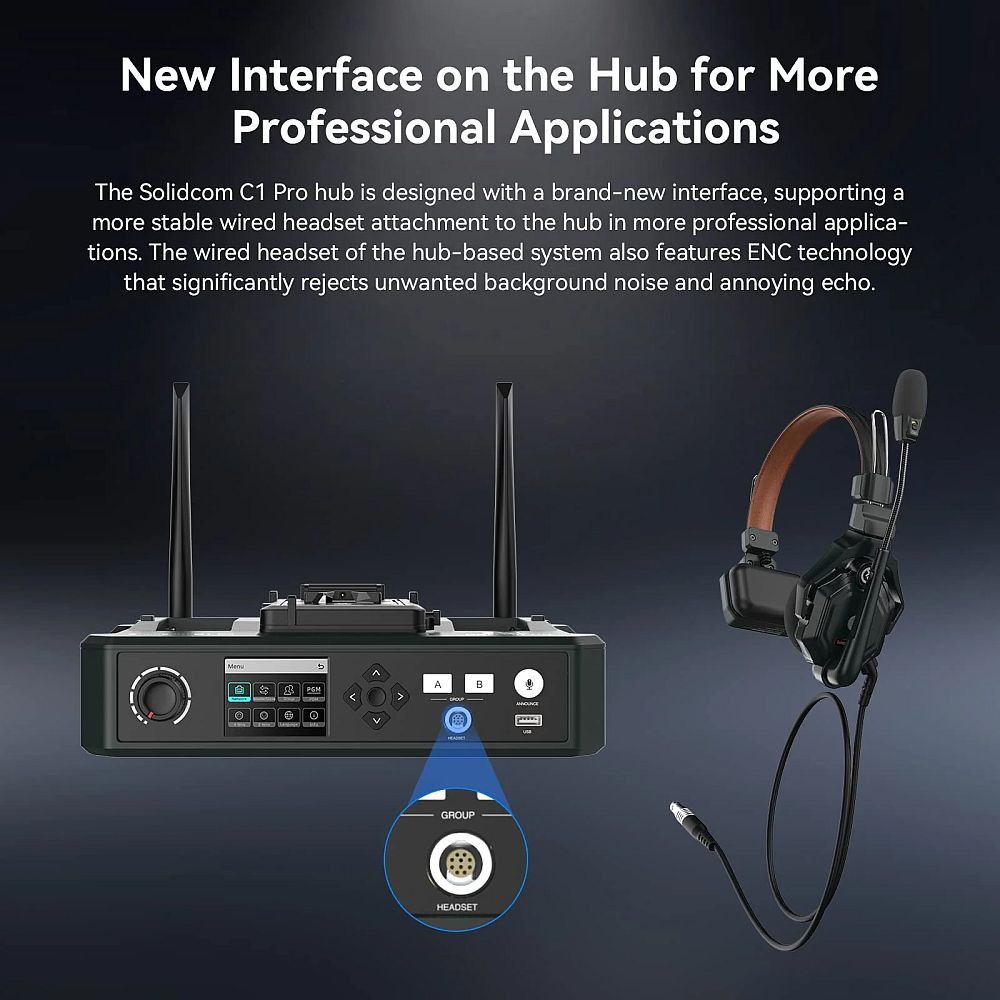 Hollyland Solidcom C1 Pro-Hub a gyártó Solidcom C1 Pro vezeték nélküli headset-es rendszerének Hub-bal kiegészített változata, mely szintén az 1,9GHz-es frekvenciasávban működik DECT technológiát használva full-duplex kommunikációs módban. Az alap C1 Pro rendszerhez a Hub további funkciókat tesz lehetővé, mint pl. a csoportok kezelése, továbbá a Hub által a rendszer bővíthető kaszkádolással és más intercom rendszerekhez való csatlakoztatással.