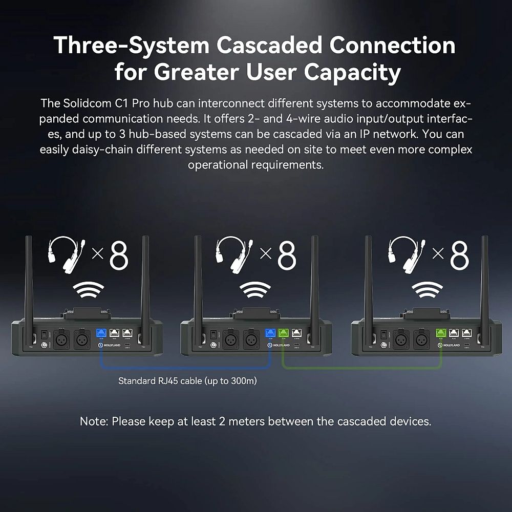 A Hollyland Solidcom C1 Pro-Hub4S 4db vezeték nélküli headset-et tartalmaz valamint 1db, Hub-hoz csatlakoztatható vezetékes headset-et, így összeségében 5 felhasználó kommunikációjához alkalmas. A szett tovább bővíthető egy Hub-hoz egészen 8 vezeték nélküli headset-ig, vagyis a Hub vezetékes headset-jével együtt összesen 9 felhasználóig. Több Hub összekapcsolásával pedig még összetettebb rendszerek alakíthatók ki, akár korlátlan számú felhasználóra. A rendszer bővítési lehetőségeit lásd részletesen a termékleírás 'Solidcom C1 Pro rendszer bővítése' részében.