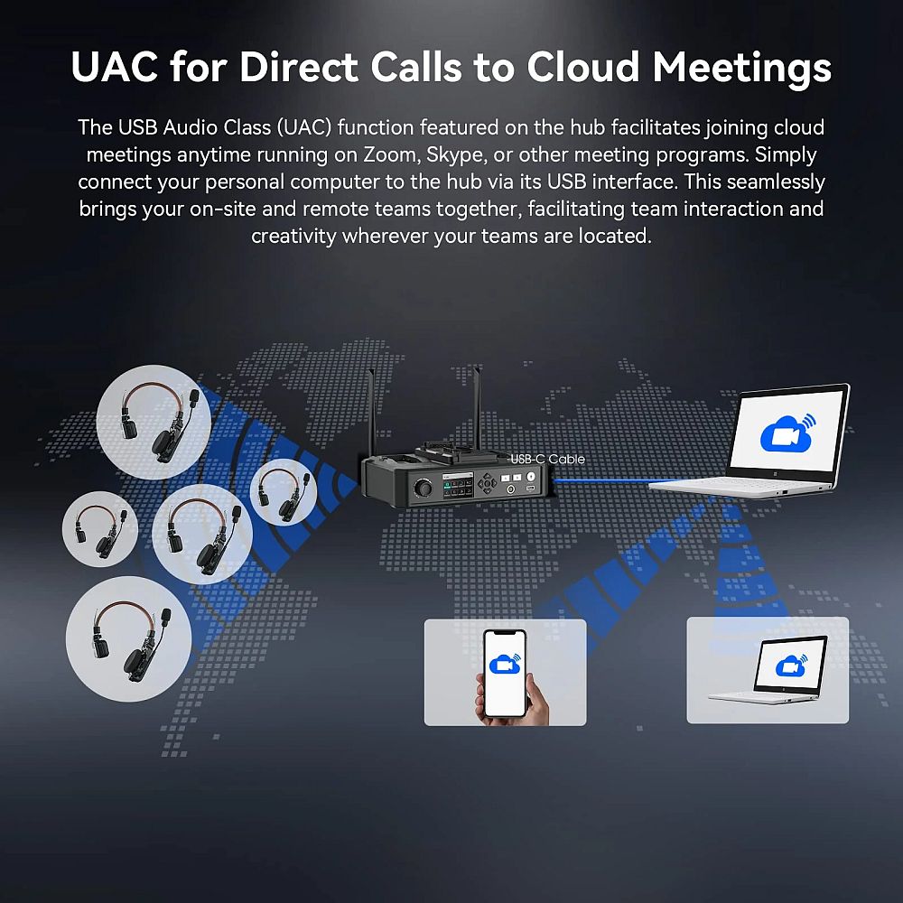 - A Hub UAC (USB Audio Class) funkciója lehetővé teszi a felhő alapú kapcsolat létrehozását a Hub-bal, hogy létrejöhessen a kommunikáció a világ bármely pontja és a Hub-hoz kapcsolódó (C1 Pro) csoportok között. A kapcsolódáshoz a Hub USB portját kell összekötni egy meeting szoftvert (Skype, Zoom, stb.) futtató laptoppal, számítógéppel. A meeting résztvevői mobil eszközről (telefonról, tabletről) vagy Laptopról, PC-ről becsatlakozhatnak a C1 Pro csoportok kommunikációjába. Az UAC lehetővé teszi a kommunikációt a helyszíni és a távoli csapatok között, bárhol is legyenek.