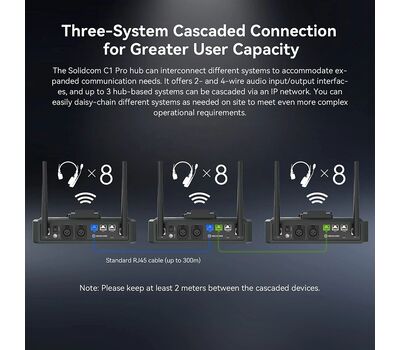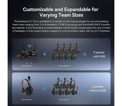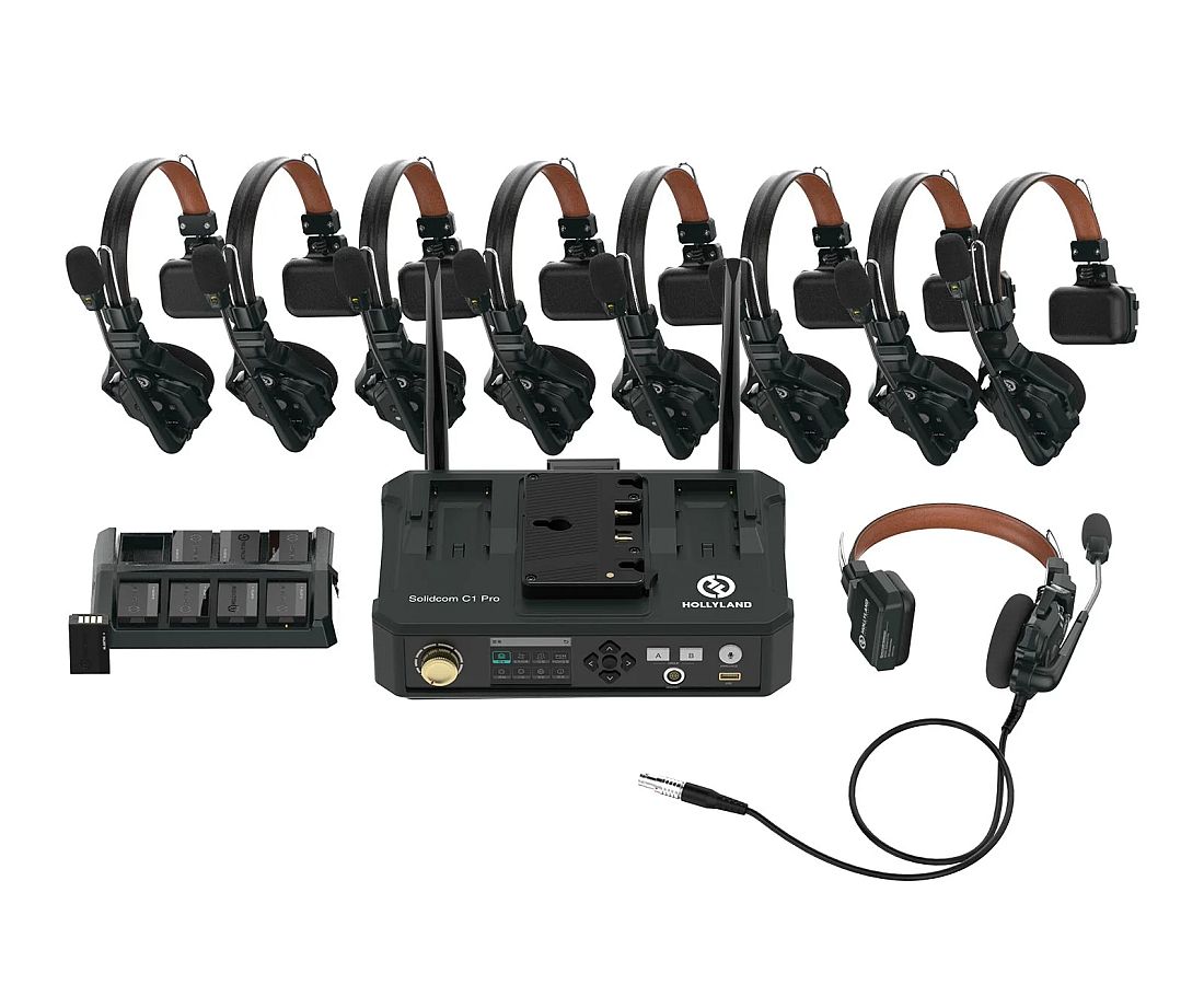 A Hollyland Solidcom C1 Pro-Hub8S 8db vezeték nélküli headset-et tartalmaz valamint 1db, Hub-hoz csatlakoztatható vezetékes headset-et, így összeségében 9 felhasználó kommunikációjához alkalmas. Több Hub összekapcsolásával összetett rendszerek alakíthatók ki, akár korlátlan számú felhasználóra. A rendszer bővítési lehetőségeit lásd részletesen a termékleírás 'Solidcom C1 Pro rendszer bővítése' részében.