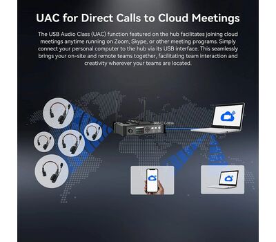 - A Hub UAC (USB Audio Class) funkciója lehetővé teszi a felhő alapú kapcsolat létrehozását a Hub-bal, hogy létrejöhessen a kommunikáció a világ bármely pontja és a Hub-hoz kapcsolódó (C1 Pro) csoportok között. A kapcsolódáshoz a Hub USB portját kell összekötni egy meeting szoftvert (Skype, Zoom, stb.) futtató laptoppal, számítógéppel. A meeting résztvevői mobil eszközről (telefonról, tabletről) vagy Laptopról, PC-ről becsatlakozhatnak a C1 Pro csoportok kommunikációjába. Az UAC lehetővé teszi a kommunikációt a helyszíni és a távoli csapatok között, bárhol is legyenek.