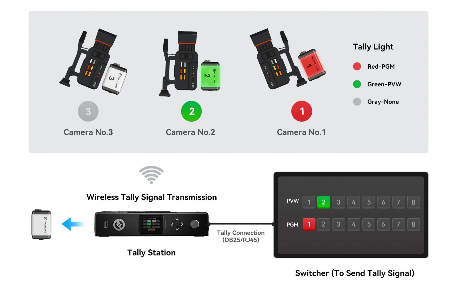 A Hollyland Tally állomásból és a Hollyland vezeték nélküli Tally lámpákból egy komplett akár 16-csatornás vezeték nélküli Tally rendszer állítható össze, mely ~800m-es hatótávolságból való működést is lehetővé tesz.