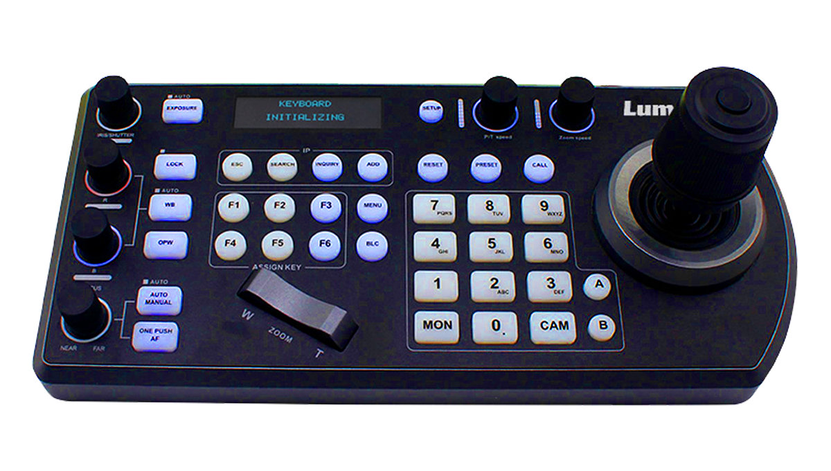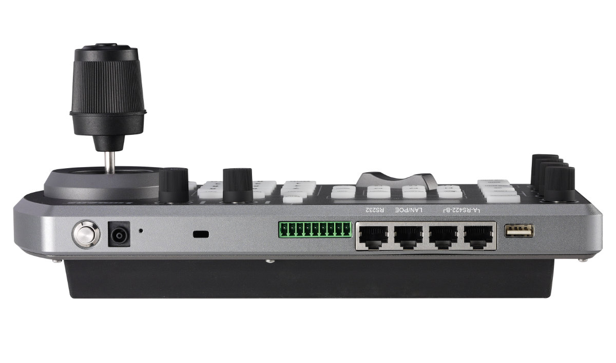 The controller is equipped with a 4-axis joystick for one-handed PTZ control, an alphanumeric keypad, six assignable buttons, and an LCD screen for navigating keyboard settings. It enables you to control PTZ movement, white balance, focus, gain, and other settings on up to 255 cameras, and it allows for up to 255 presets.